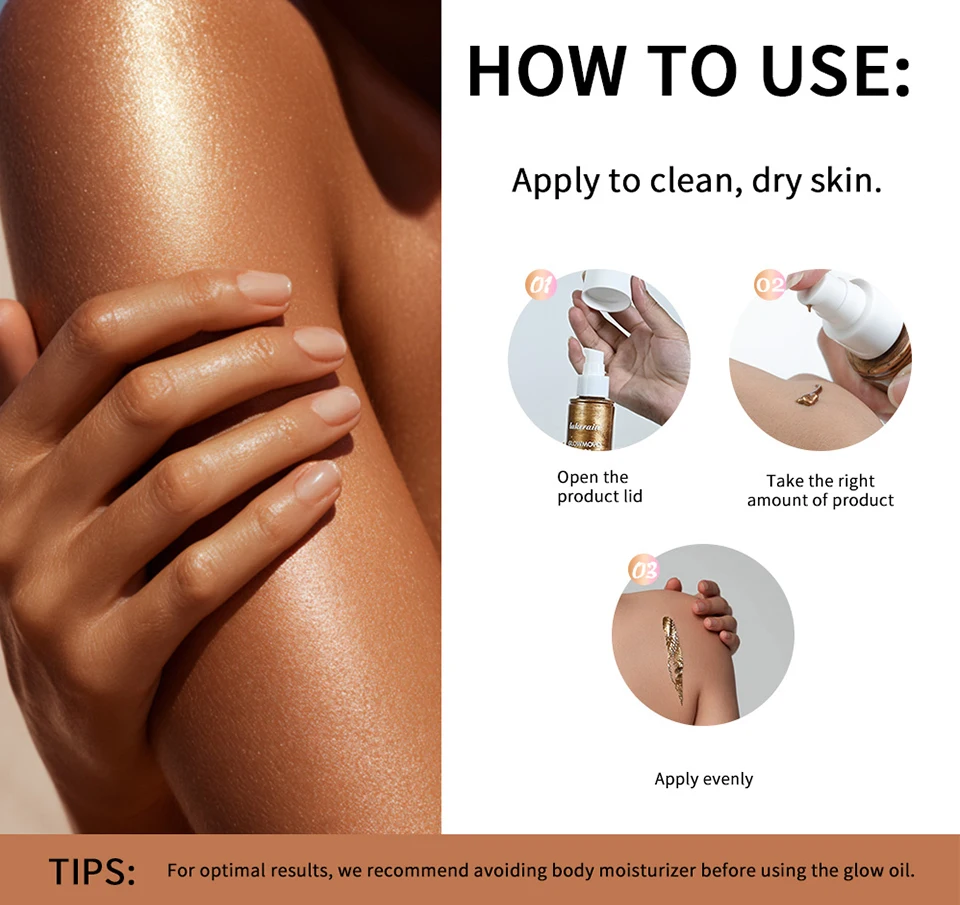 Apply to clean, dry skin. For optimal results, we recommend avoiding body moisturizer before using the glow oil.