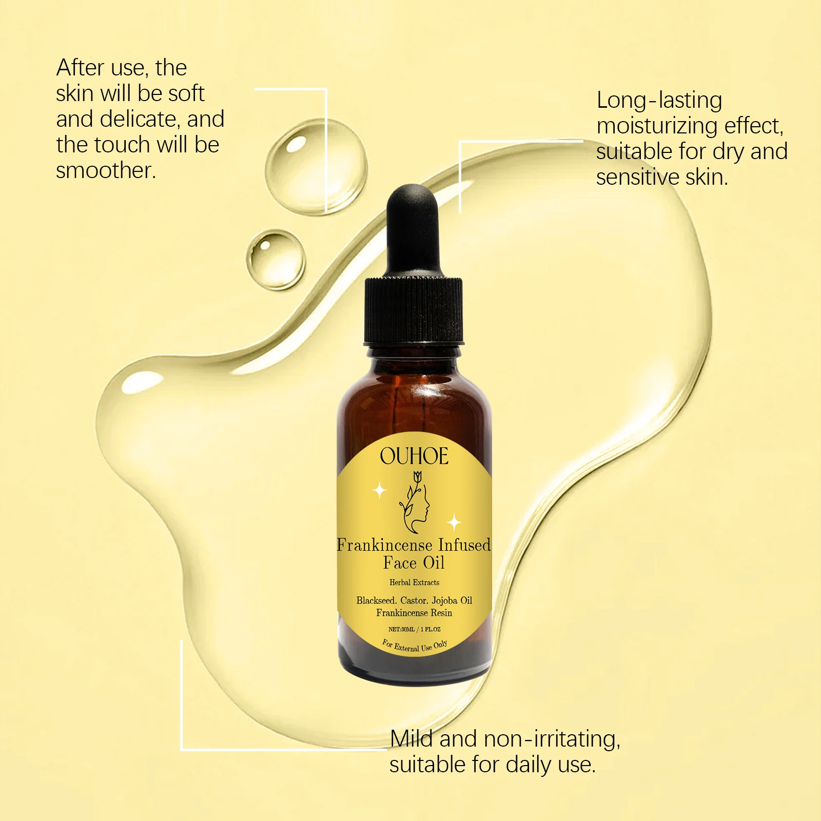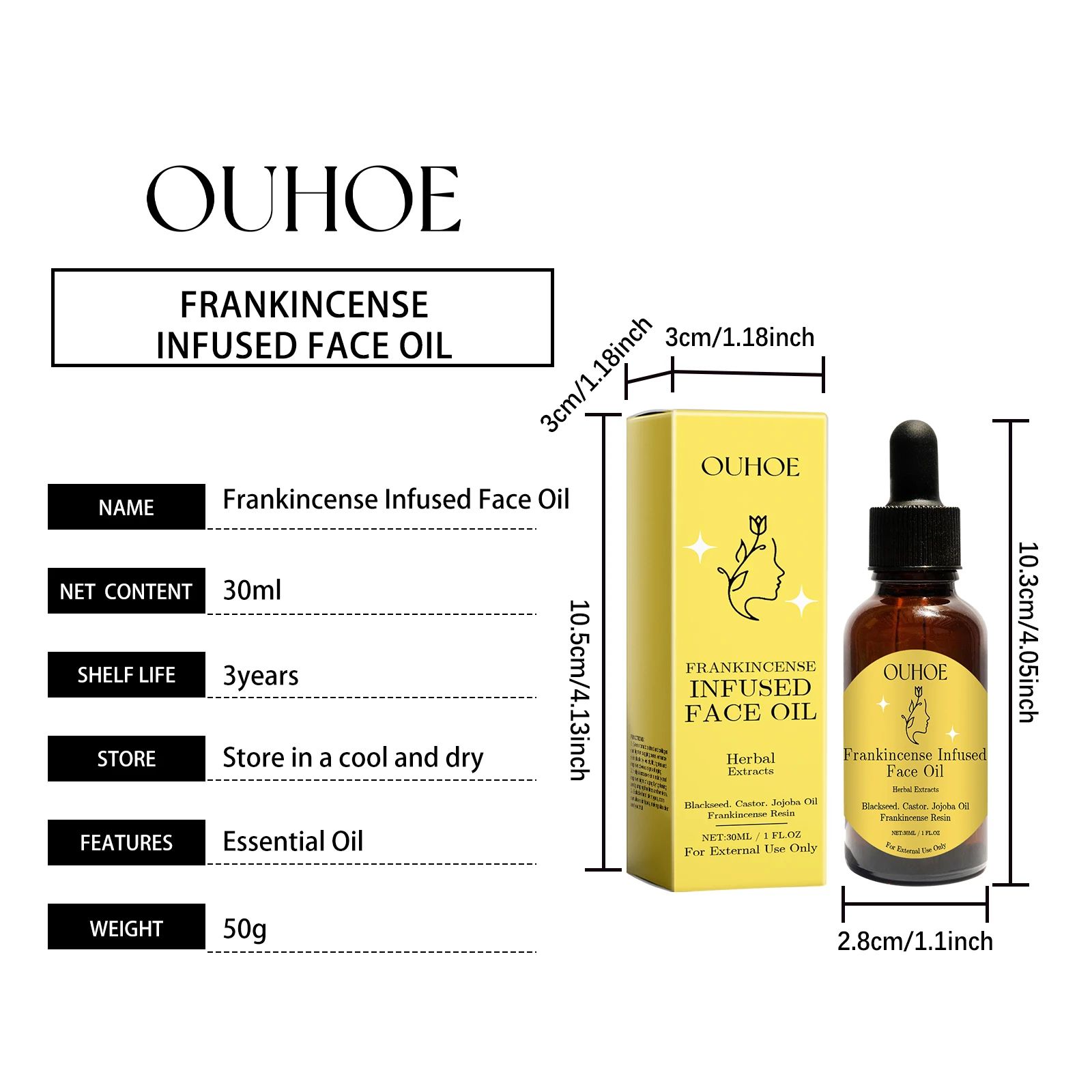 Revitalize your skin with Ouhoe Frankincense Face Oil — your all-in-one solution for dryness, dullness, and loss of elasticity. Crafted from natural plant ingredients, this gentle, chemical-free oil moisturizes, firms, and brightens, restoring your skin’s youthful glow. Perfect for sensitive or aging skin, it soothes irritation, locks in long-lasting moisture, and improves overall skin quality. Use daily on face and neck to reveal soft, radiant, and healthy skin that looks and feels rejuvenated.